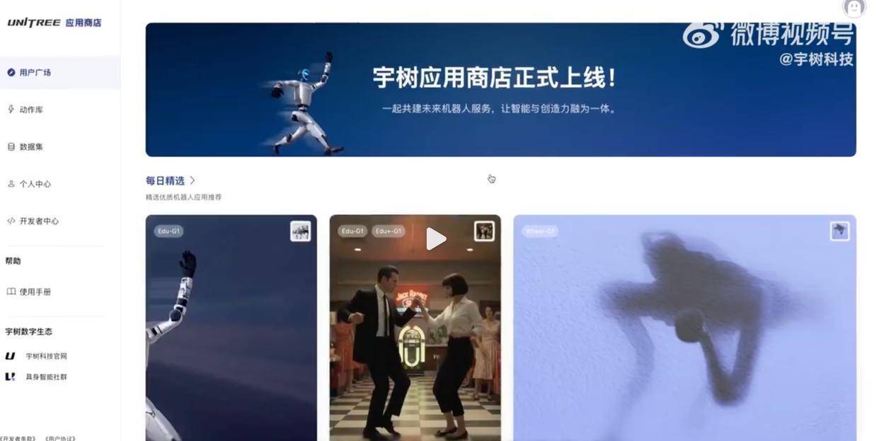 今日,宇树科技宣布推出宇树应用商店,这是专为机器人打造的全球功能共享中心融创配资,用户可以将训练好的舞蹈、武术、干活等模型一键上传分享,也可以下载其他开发者开发的动作部署到机器人上。